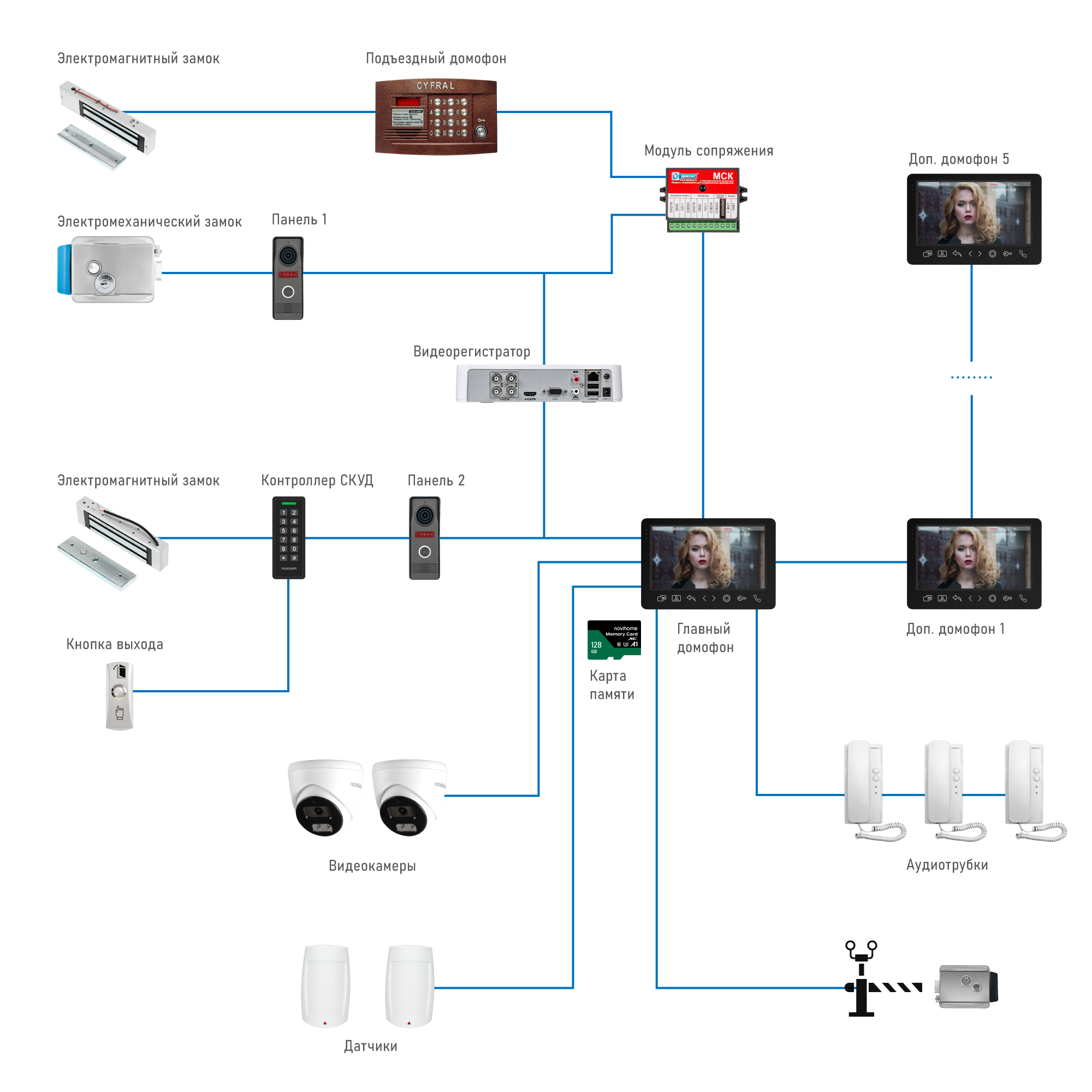 - Подключение до 2 вызывных панелей, до 5 доп.домофонов, до 3 аудиотрубок, до 3 видеокамер и до 2 датчиков