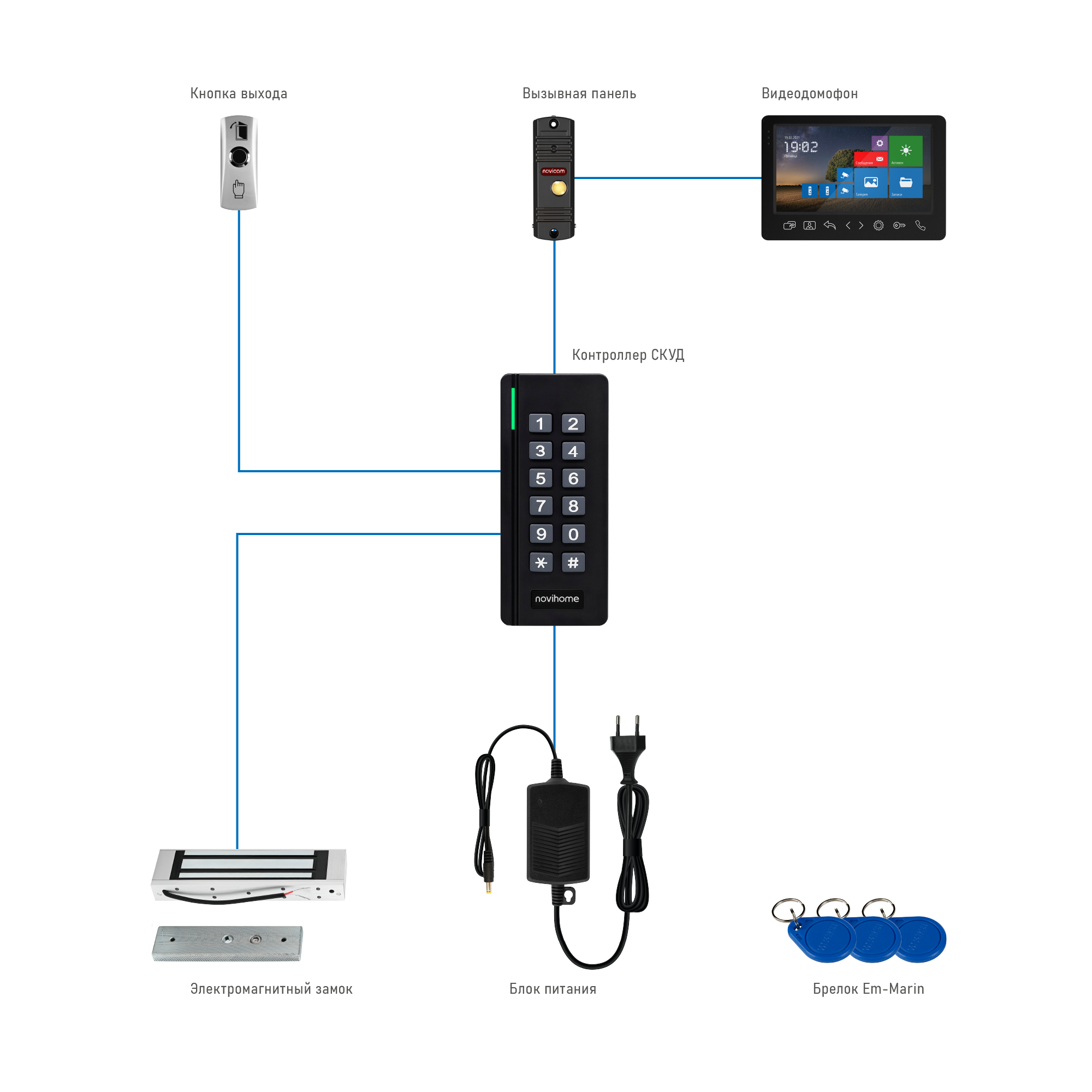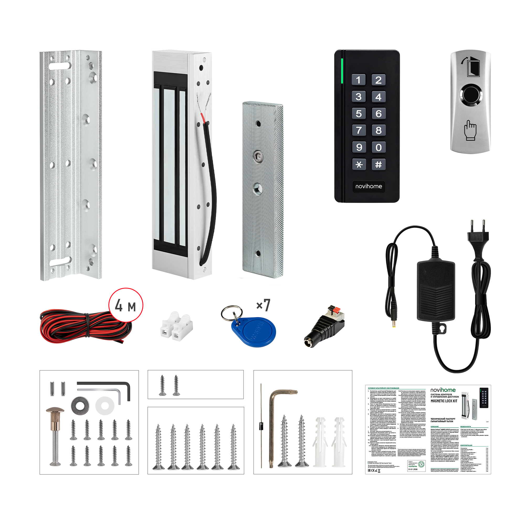 - Блок питания, кнопка выхода, кабель, разъемы и крепеж в комплекте